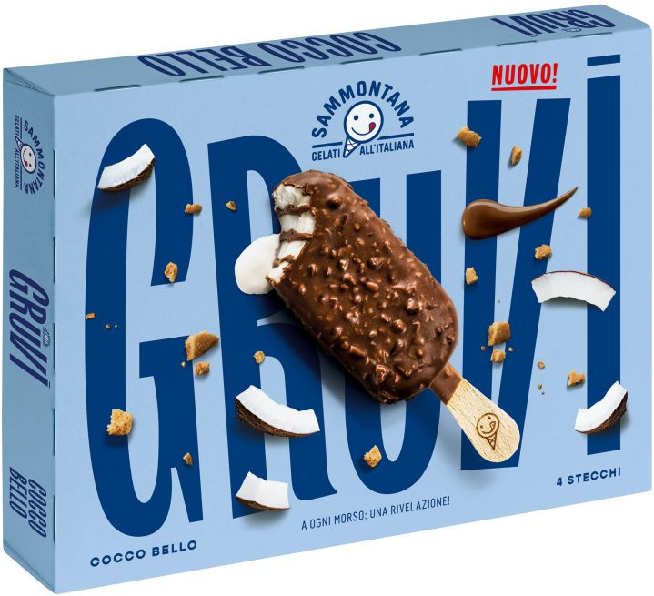 Rehydrated skimmed milk - Sugar - Glucose syrup - Coconut oil - Meringues (5%)(Sugar, Wheat starch, Egg white powder, Flavourings) - Fresh pasteurized cream (3,5%) - Milk proteins - Cocoa - Chocolate drops (1%)(Roasted cocoa beans pieces, Cane sugar, Cocoa butter, Emulsifier: soya lecithins) - Amaretti pieces (1%)(Sugar, Apricot kernel, Egg white, Almonds, Raising agents: sodium carbonates, ammonium carbonates) - Chocolate (0,8%)(contains soya) - Chopped pralined hazelnut (0,5%)(Hazelnuts 55%, Sugar, Glucose syrup) - Emulsifier: mono- and diglycerides of fatty acids - Stabilizers: sodium alginate, locust bean gum - Gelling agent: pectins - Flavouring.